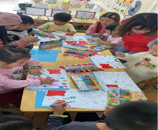 之后活动由志愿者们分两组带领小朋友进行了童绘《我和我的祖国》美术作品、快乐手工《我和我的祖国》diy贴画。在欢乐的游戏过程中,引导小朋友一起用手中的画笔描绘对祖国的感知、赞美和祝福。