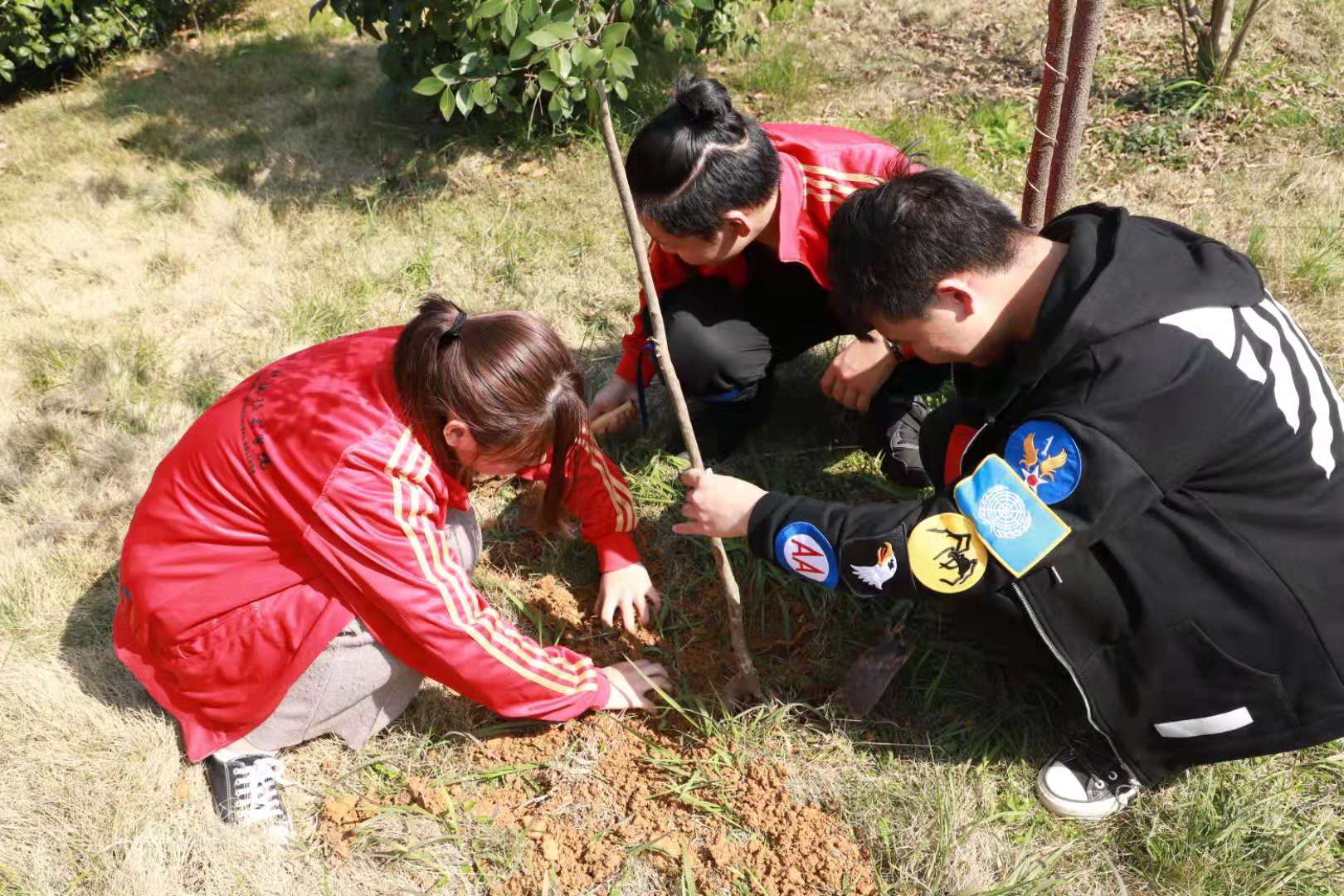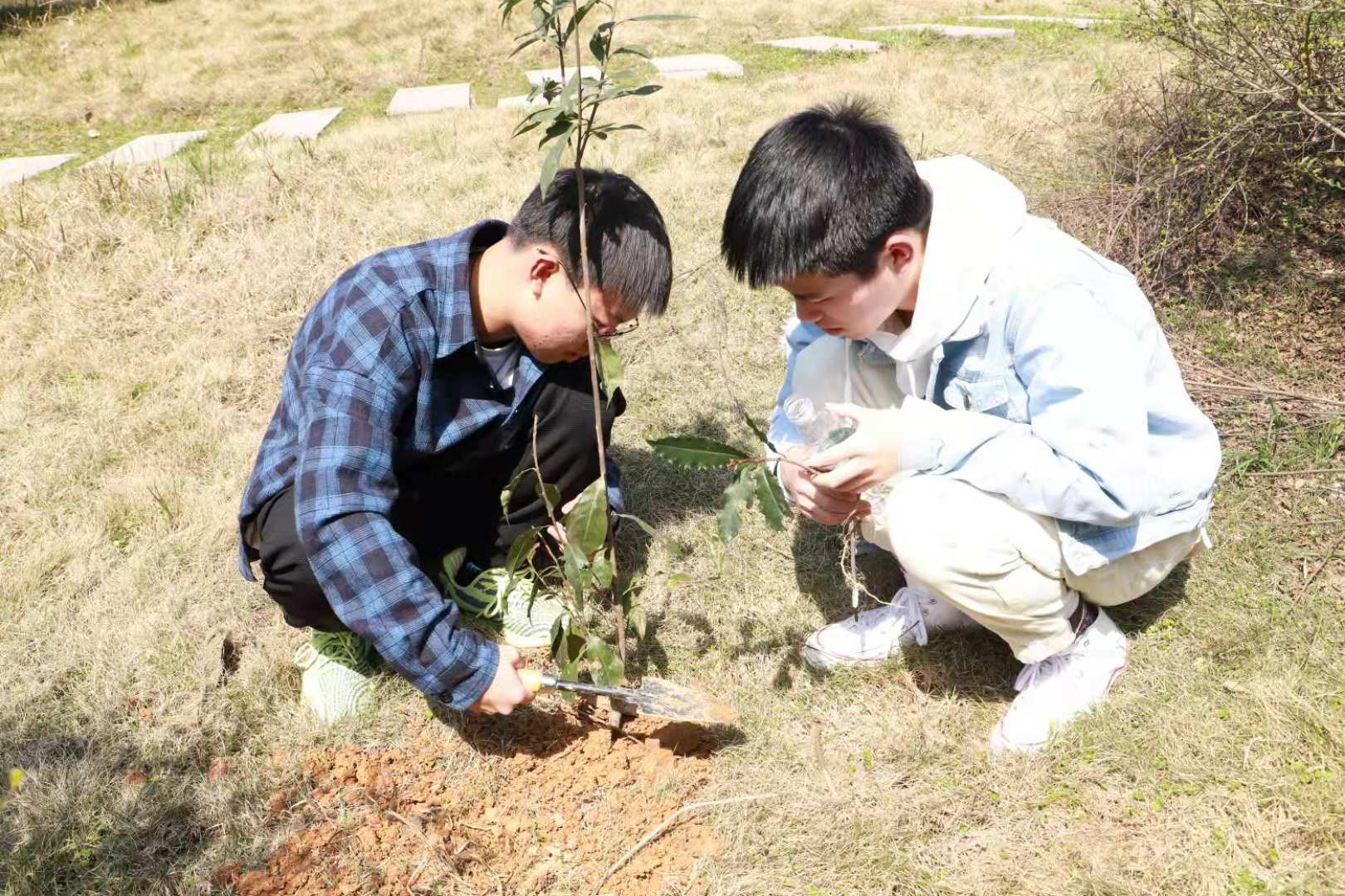 植树活动中,同学们分工合作,挖坑、栽植、填土、浇水,大家都热情高昂,齐心协力,撸起袖子加油干,挥舞铁锹翻新土,将一棵棵充满生机和希望的树苗植入土中。