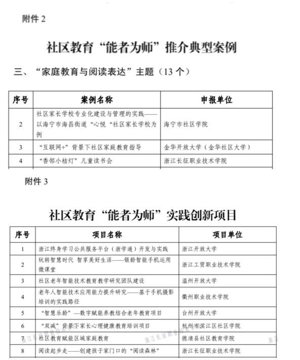 根据《浙江省教育厅办公室关于确认教育部社区教育“能者为师”“智慧助老”等项目名单的通知》,我校基础部陈燕老师的2个项目入选,其中,《“香邻小桔灯”儿童读书会》项目入选“社区教育‘能者为师’推介典型案例”中的“家庭教育与阅读表达”主题;《阅读起步走——创建孩子家门口的“阅读森林”》项目入选“社区教育‘能者为师’实践创新项目”。