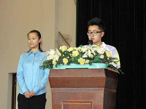 大会在雄伟壮烈的团歌声中拉开序幕。团委书记陶元首先介绍了我院志愿者参加第八届残运会的概况。副院长贺旭辉宣读了省委省政府表彰文件。“省级优秀志愿者”代表吴晨豪同学上台发表了志愿者生活感言。