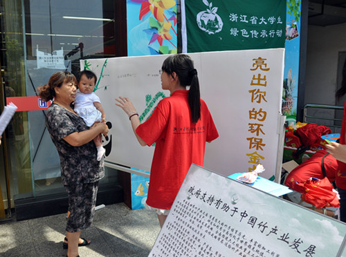 上午,为更好地宣传、普及竹文化,暑期社会实践队员在留下世纪联华超市门前摆放了有关宣传竹文化的KT板,吸引了过往路人的驻足欣赏,同时为了解市民对竹文化的认识程度,还对来往的路人进行问卷调查。在悠悠几千年历史发展的长河中,竹子与人们的生活息息相关,中国悠久的文化与竹结下了不解之缘,形成了丰富多彩、独具特色的中国竹文化。在活动现场实践队成员们还通过一次性筷子和竹筷子的对比实验一次性制品的危害进行形象的宣传,热心的市民踊跃参加,不少市民还提出各具特色的环保金点子,而队员们自制的具有净化空气效果的竹炭包作为活动小礼品更是深受市民的喜欢。